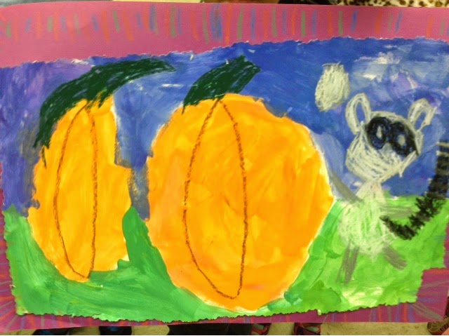 1st graders mixed primary colors to make secondary colors. I love how the students get so excited when they mix colors and the color changes. We used the secondary colors to paint our picture... Pumpkins, grass, and sky. The next class, we cut the edge of our painting with fancy scissors, glued it to a background paper, added details with oil pastels, and a pattern for he boarder. I love all the creatures students thought to add, especially the raccoon in the second picture.